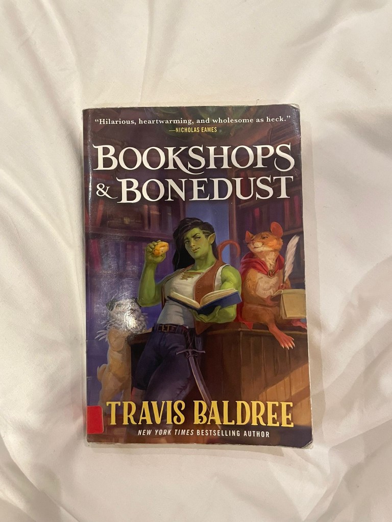 This week I’m on holiday in England and I have brought a few books on the road with me (and may have also picked up a few more since I’ve been here), but the book I’m currently reading is’ Bookshops & Bonedust’ by Travis Baldree.
