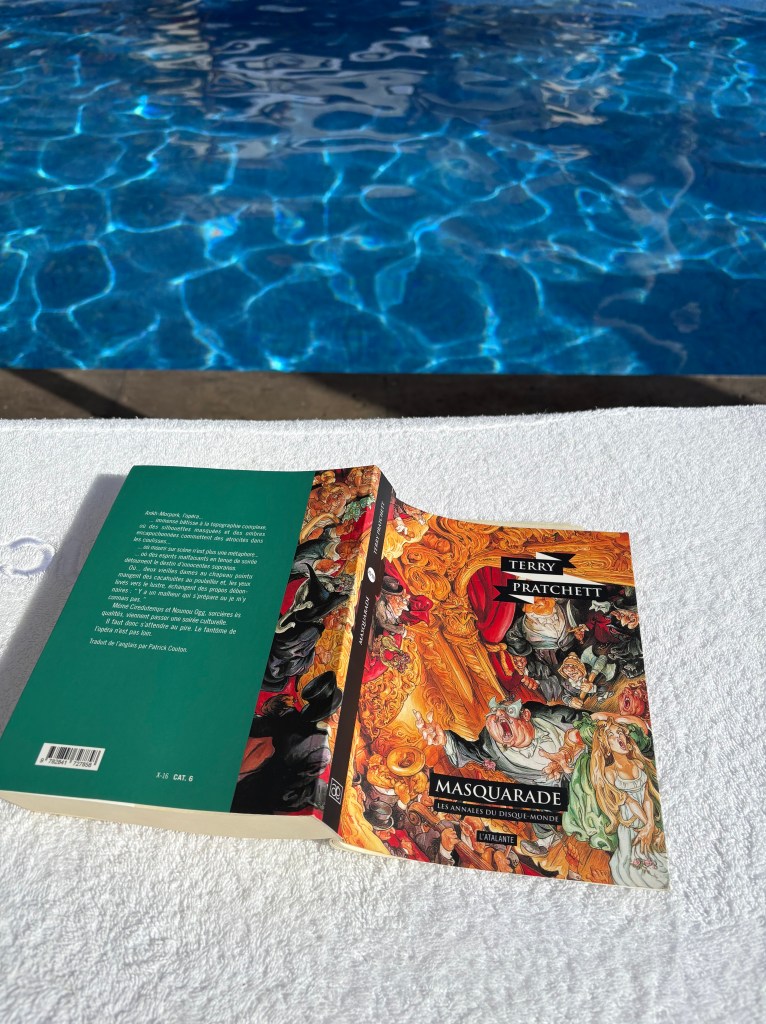 Maskerade revolves around the zany world of the Ankh-Morpork Opera —I believe it is partly a play on the Phantom of the Opera— and a few even zanier witches. As always, the cast of characters is so colourful and the premise is ridiculously fun to get lost in. There is so much texture in Pratchett’s writing and while reading it in French isn’t a walk in the park for me, it is fun to see how his humour and writing translates to another language!