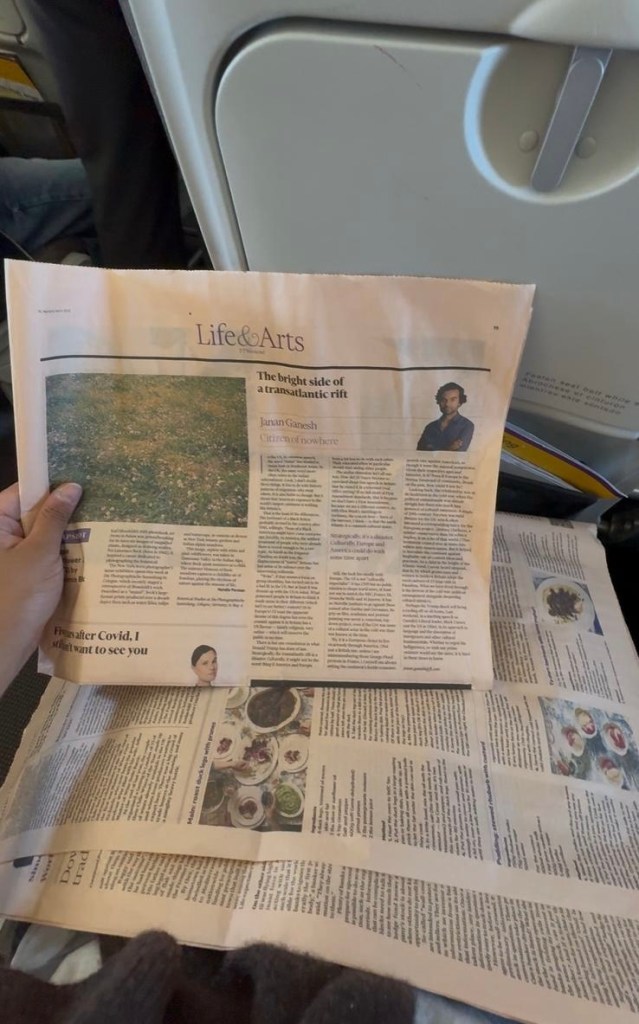 I’ve read the FT online before, but it has been a long time since I’ve read it, or any other newspaper for that matter, in print. I didn’t love all the articles and there were more than a few that I found lacking in content and in craft, but I did appreciate the variety of subjects I could skim, from an interview with India’s Foreign Minister to a spotlight on Chilean wine. The sensation of reading a print newspaper was also a delightful, if not sometimes annoying, experience. I bobbed back and forth between feeling like a distinguished adult with serious opinions about serious things to feeling like an imposter who could barely keep all the newsleafs together (seriously, they kept falling apart). All that said, reading print newspapers is somewhat of a lost art these days and I recommend it as a travel companion. I remember back when I was a kid, I used to dislike the smell of newspapers because it was the same smell I associated with stale airplane air since so many people would read papers on the plane. These days, planes don’t seem to smell like dried ink and musky paper anymore, but I say we bring it back!